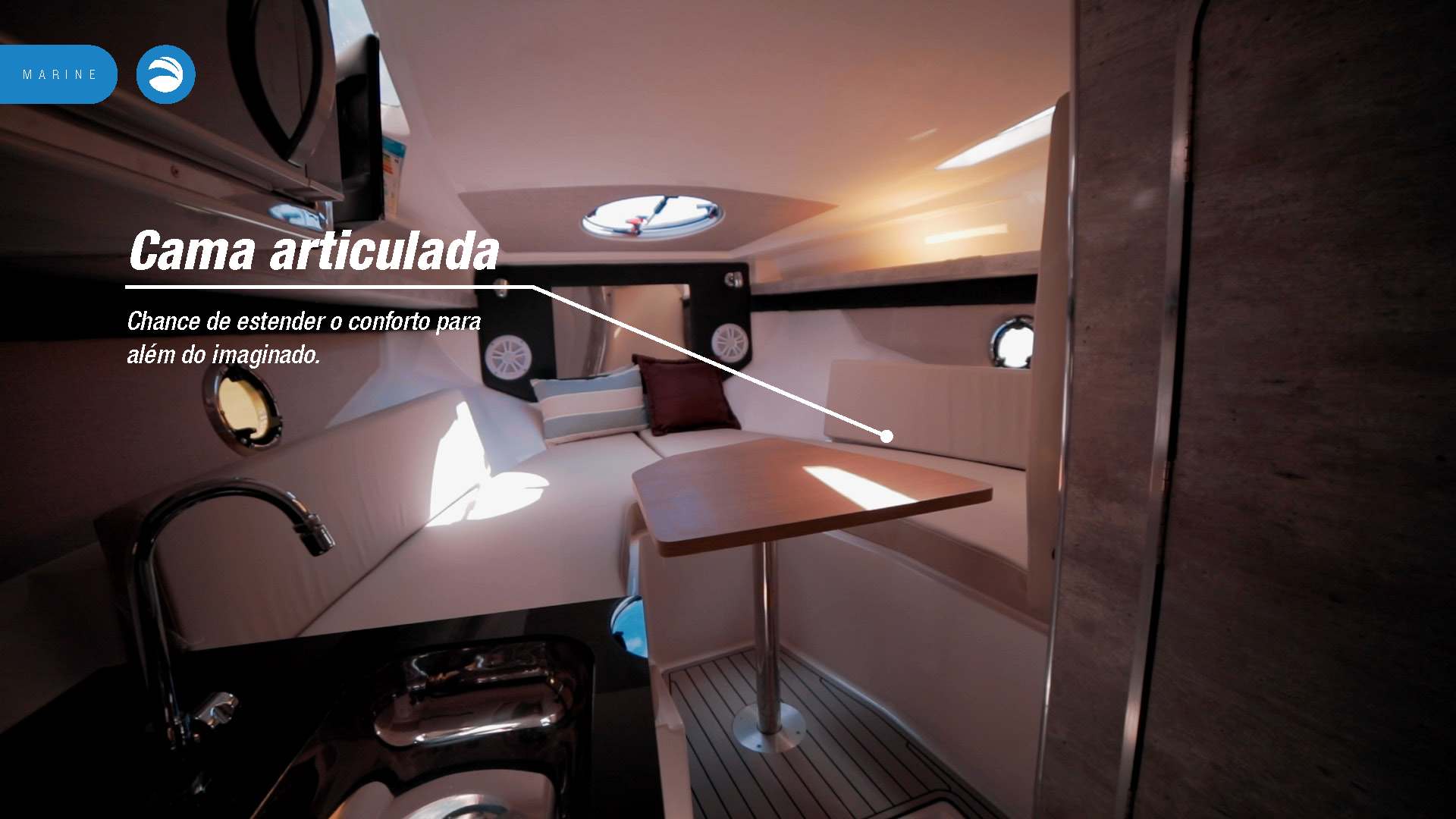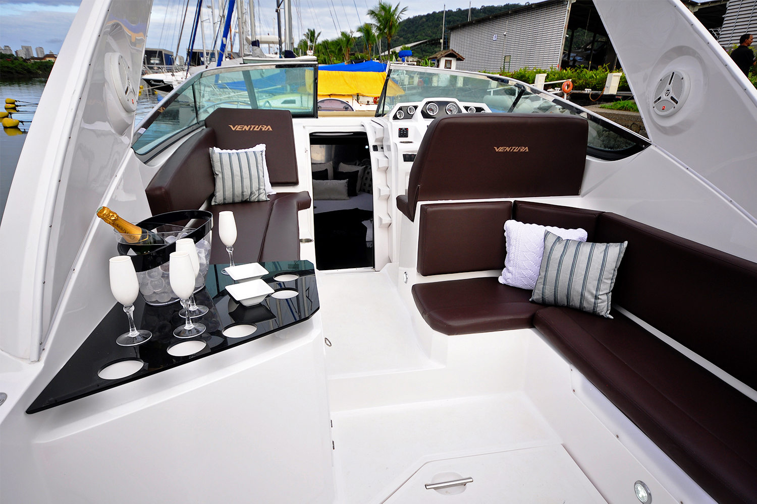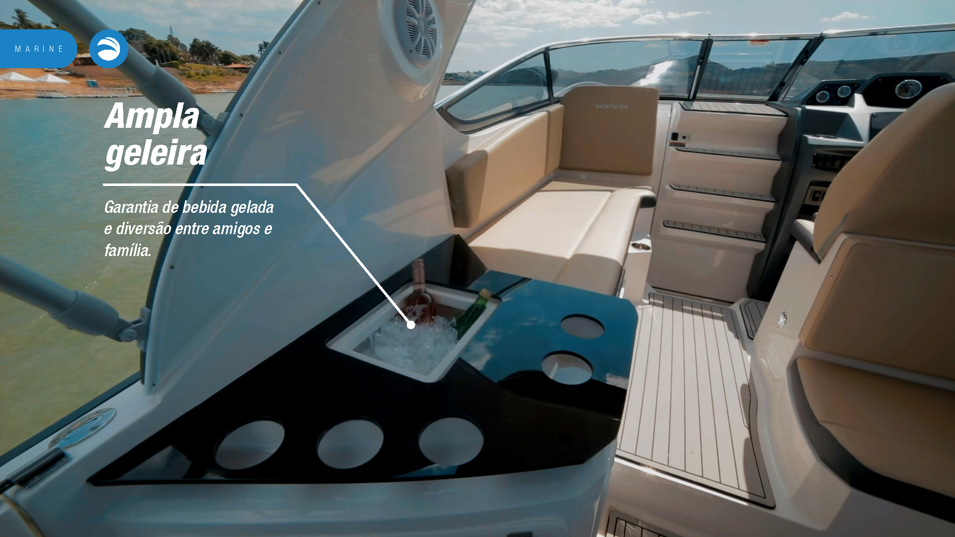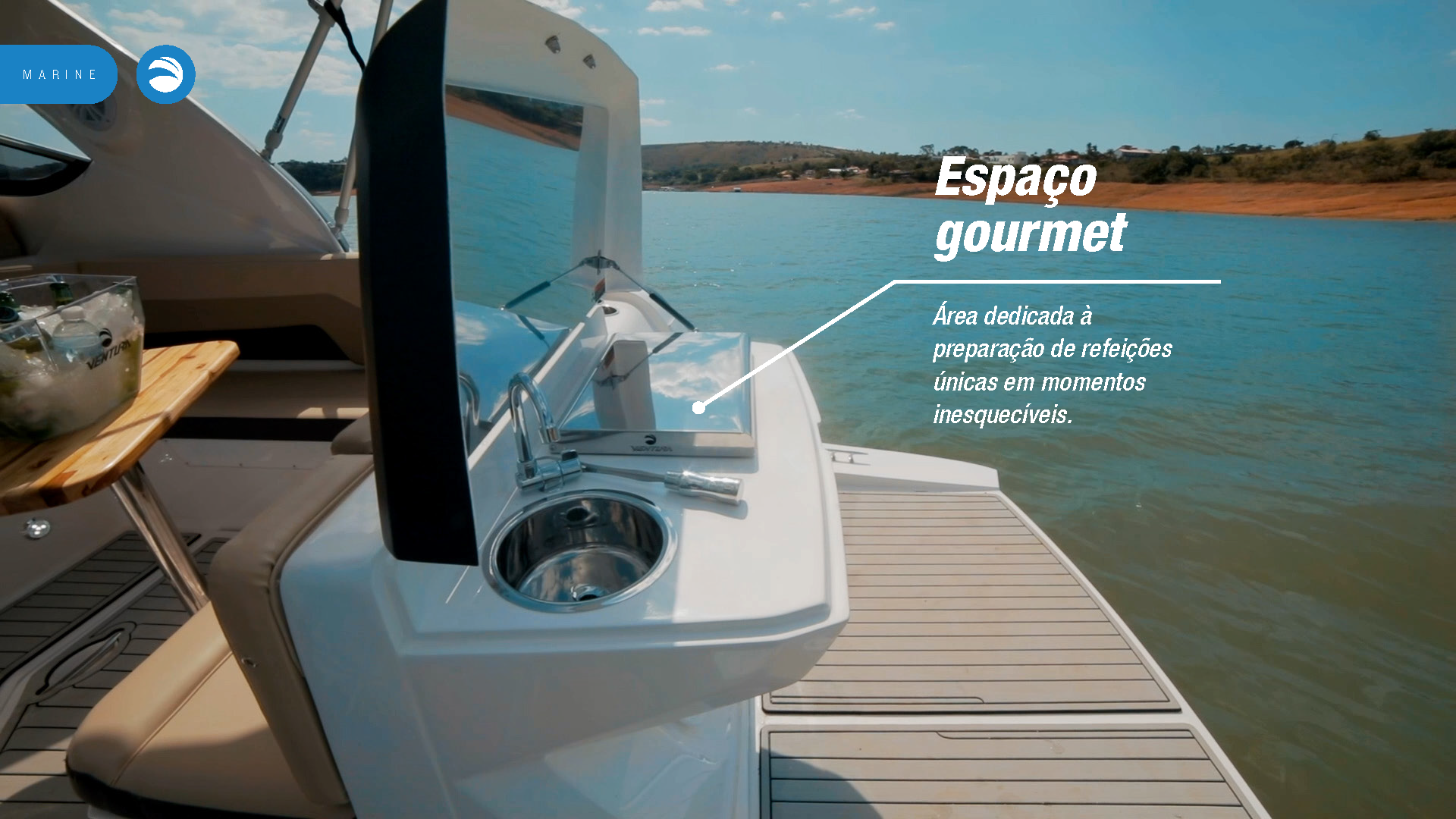 Única embarcação do mercado com cozinha interna que comporta instalação de geladeira, micro-ondas, fogão elétrico e adega de vinhos