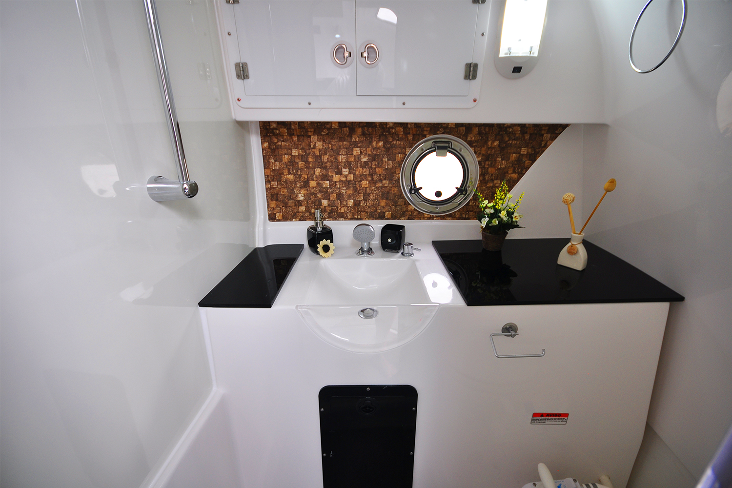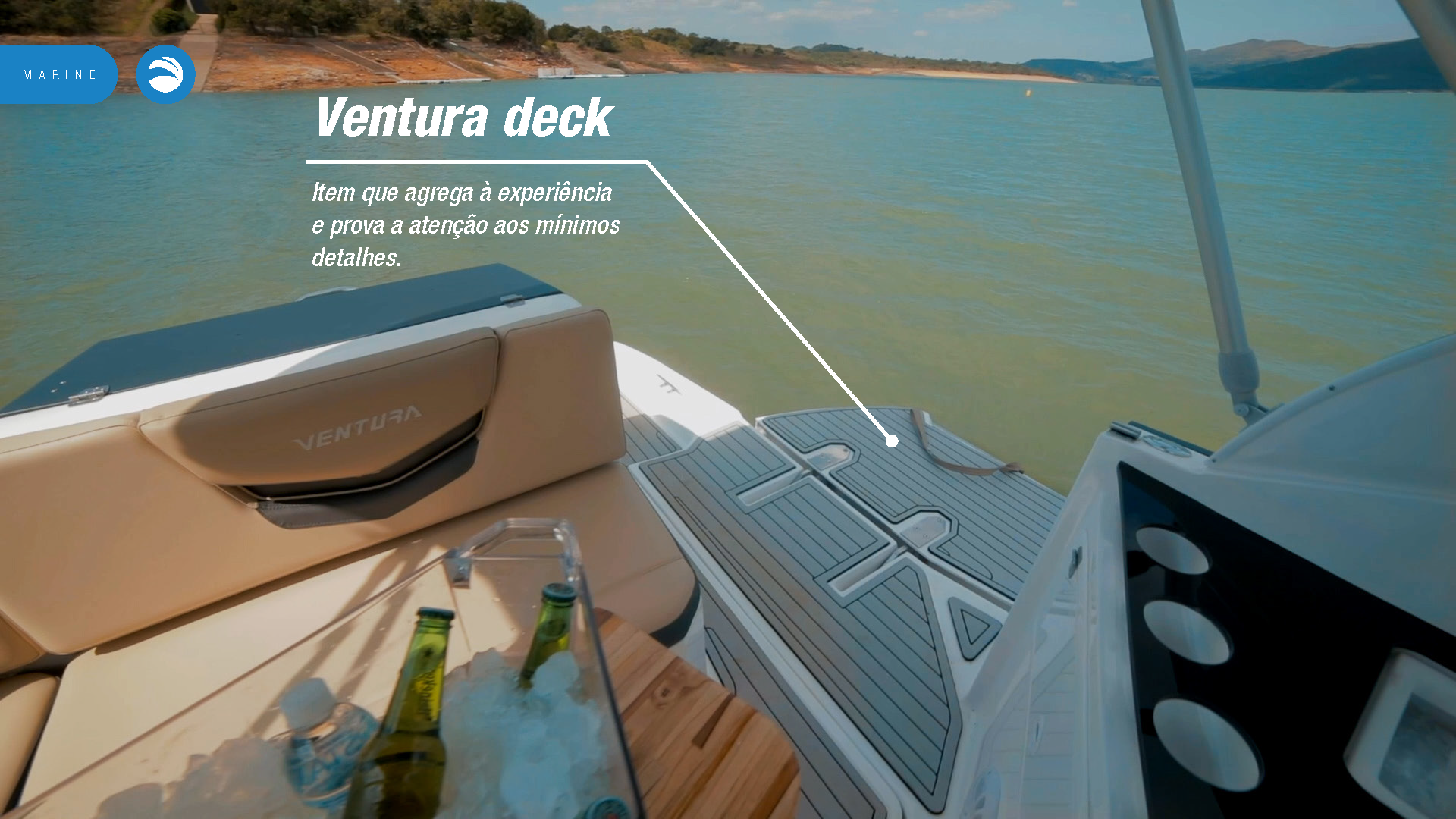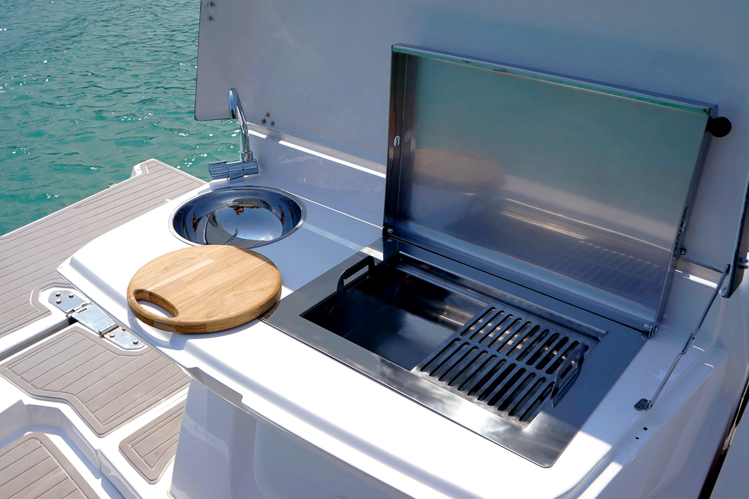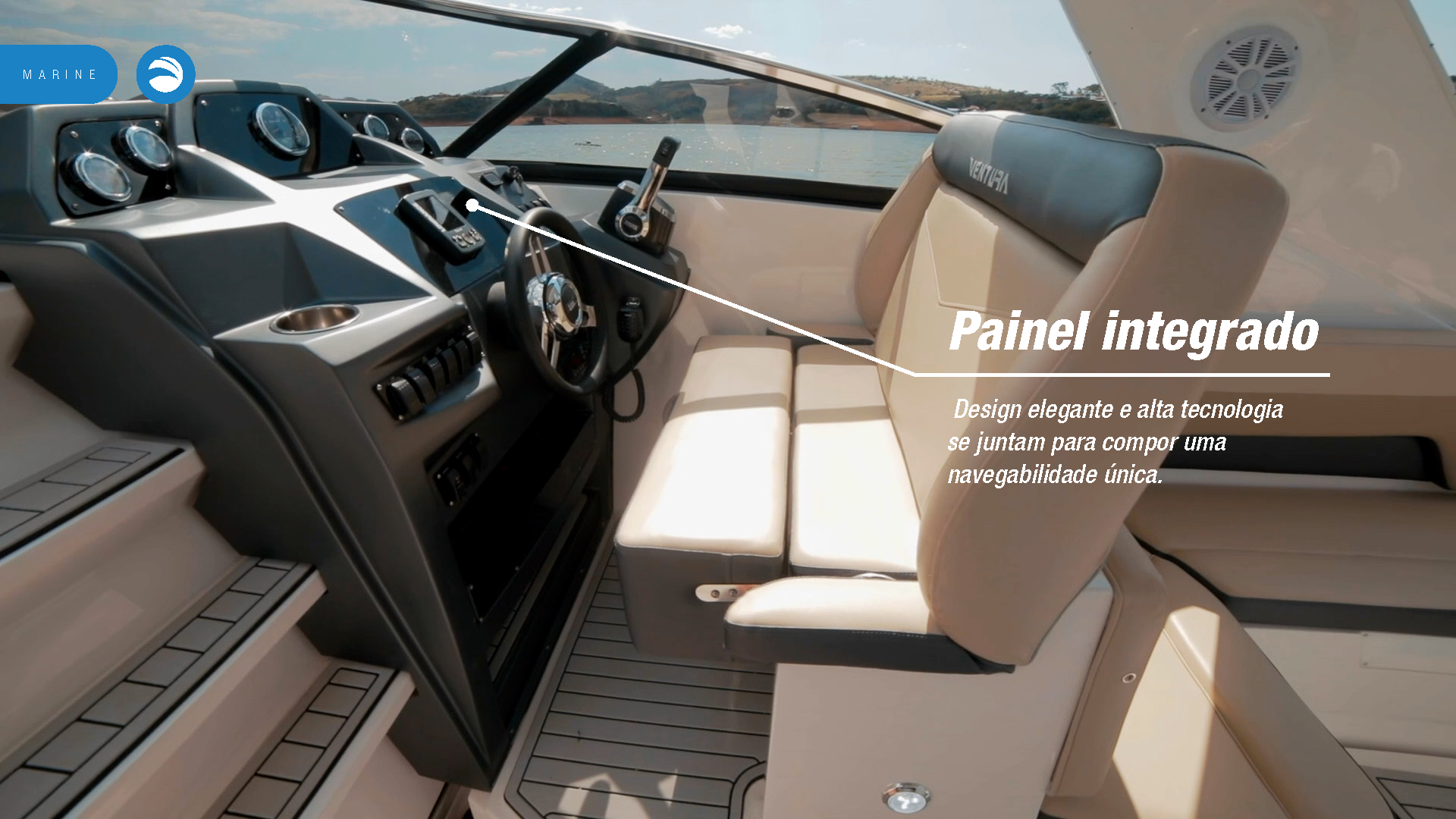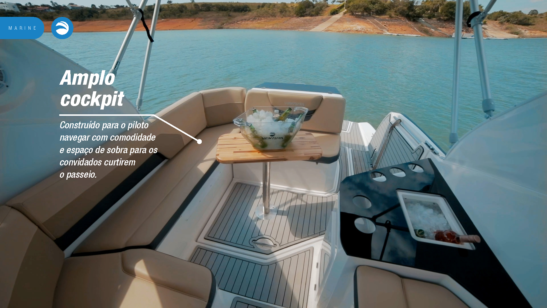 Única embarcação do mercado com cozinha interna que comporta instalação de geladeira, micro-ondas, fogão elétrico e adega de vinhos