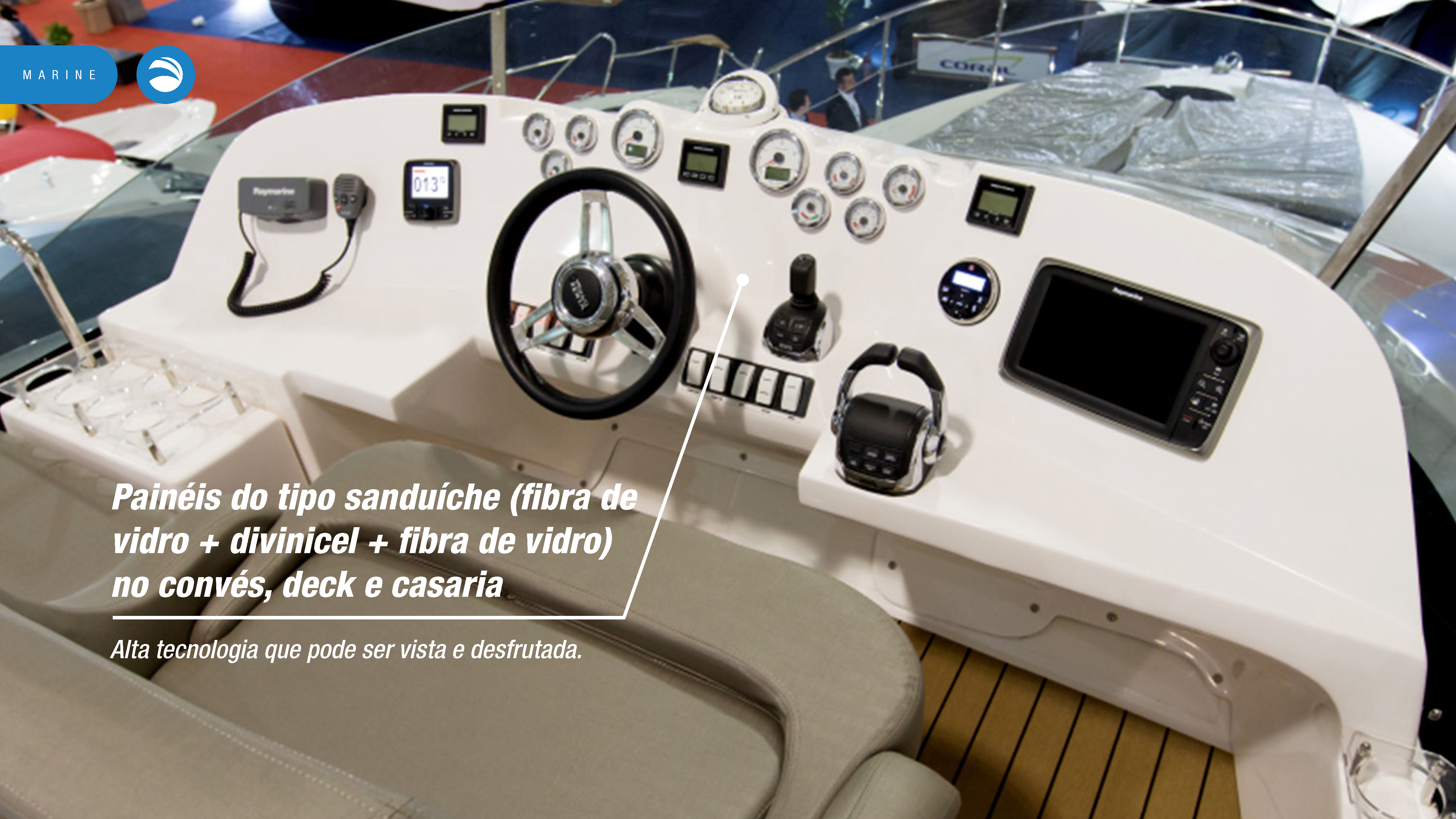 Painéis do tipo sanduíche (fibra de vidro + divinicel + fibra de vidro) no convés, deck e casaria