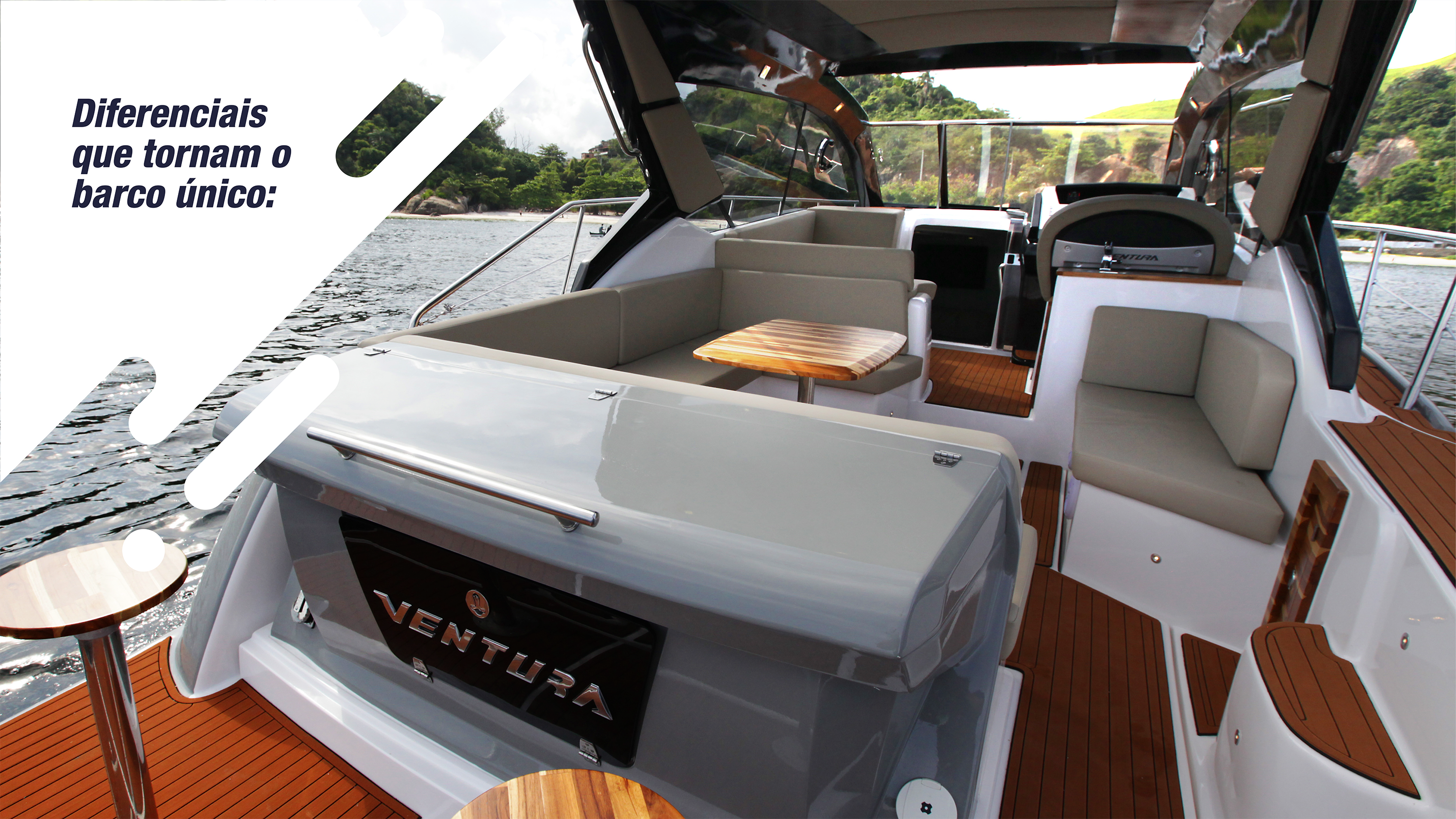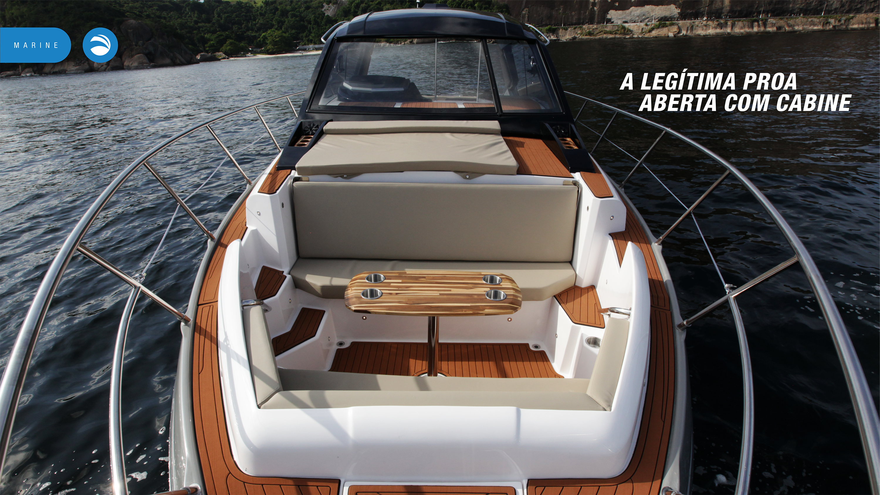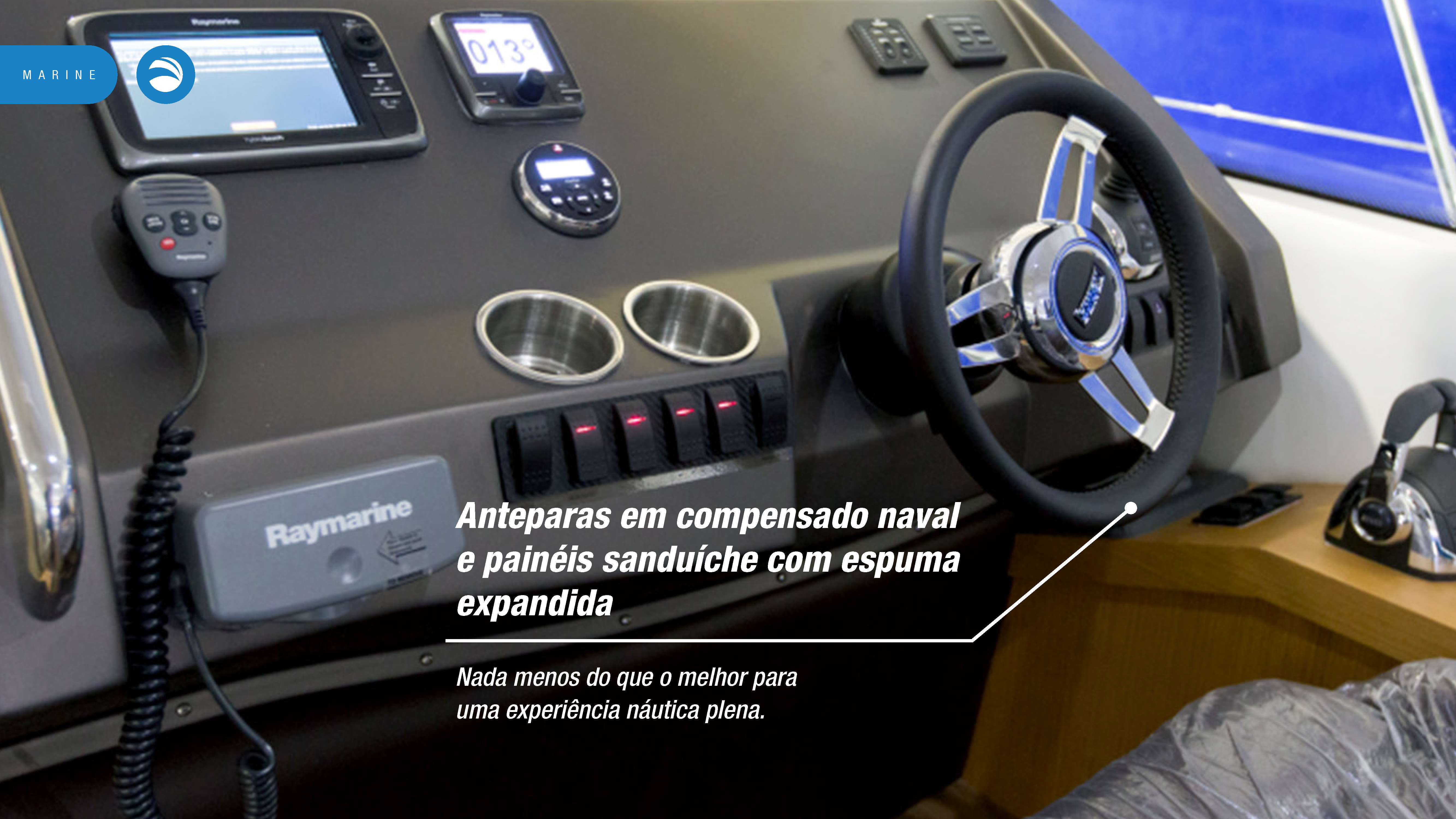 Acesso através do cockpit via escada em fibra de vidro integrada à estrutura em aço inox, instrumentos primários dos motores (termômetros, indicadores de pressão, tacômetros), volante, caixa de direção com regulagem de altura