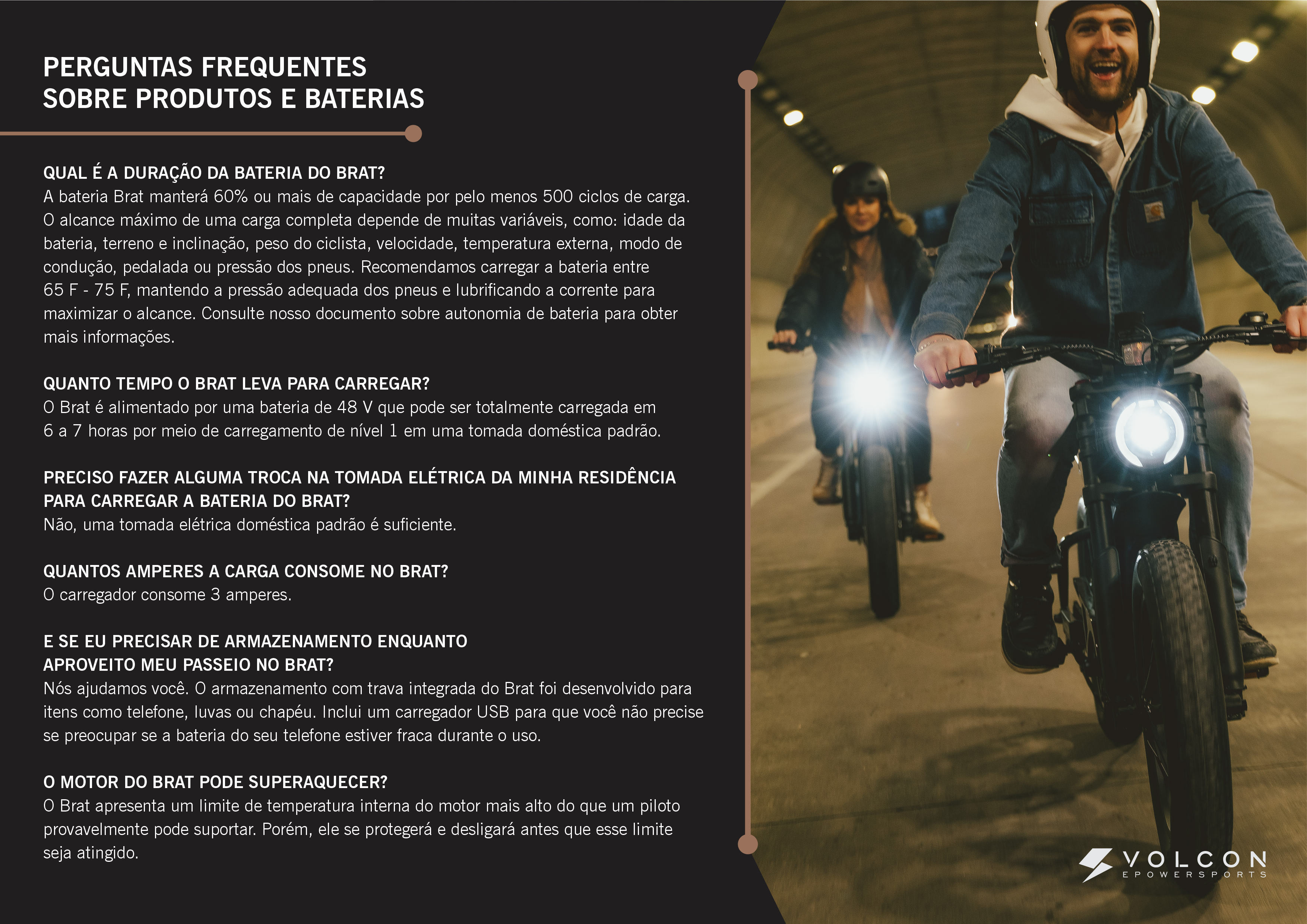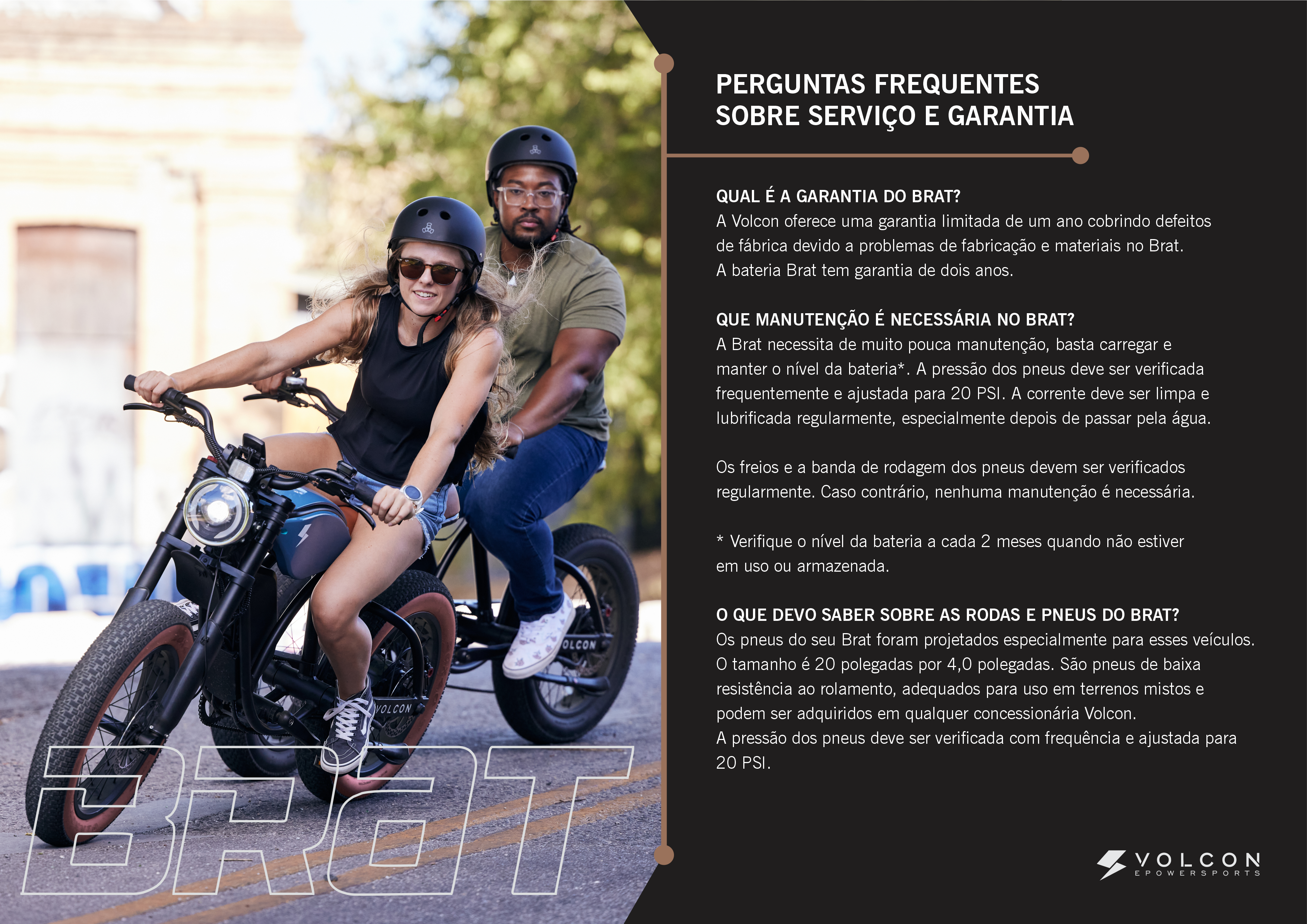 A Volcon oferece uma garantia limitada de um ano cobrindo defeitos de fábrica devido a problemas de fabricação e materiais no Brat. A bateria Brat tem garantia de dois anos.