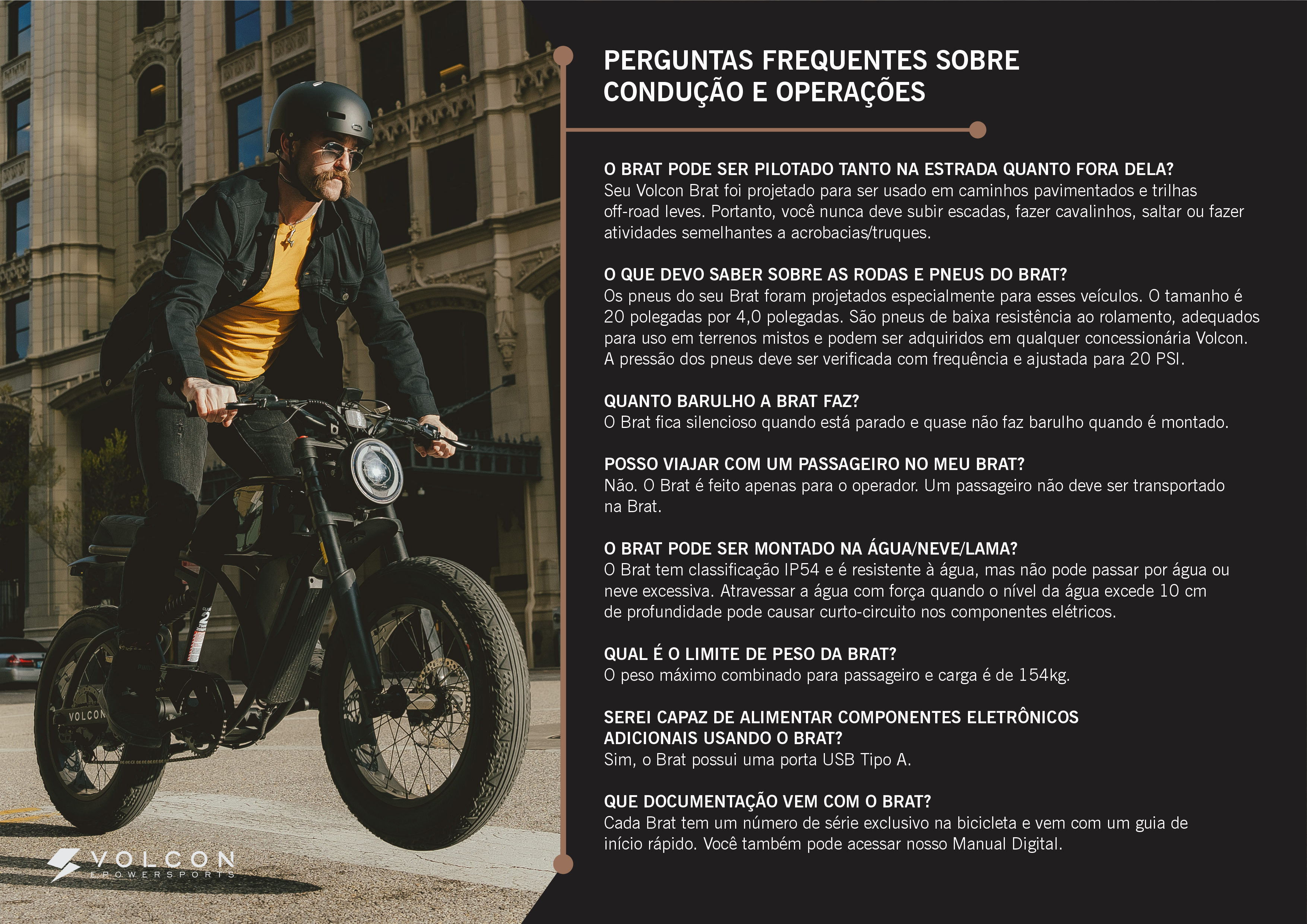 Seu Volcon Brat foi projetado para ser usado em caminhos pavimentados e trilhas off-road leves. Portanto, você nunca deve subir escadas, fazer cavalinhos, saltar ou fazer atividades semelhantes a acrobacias/truques.