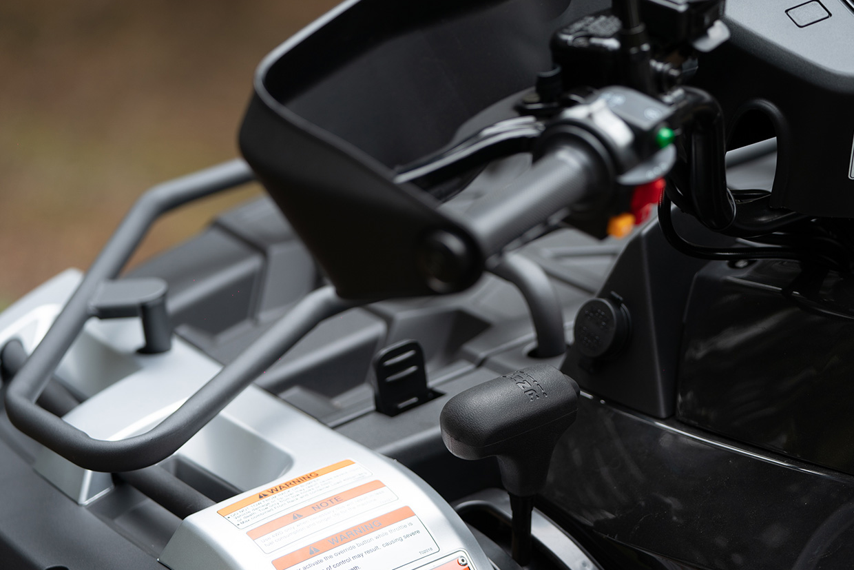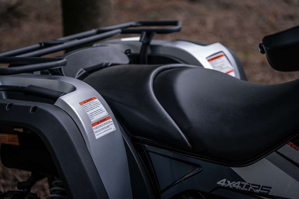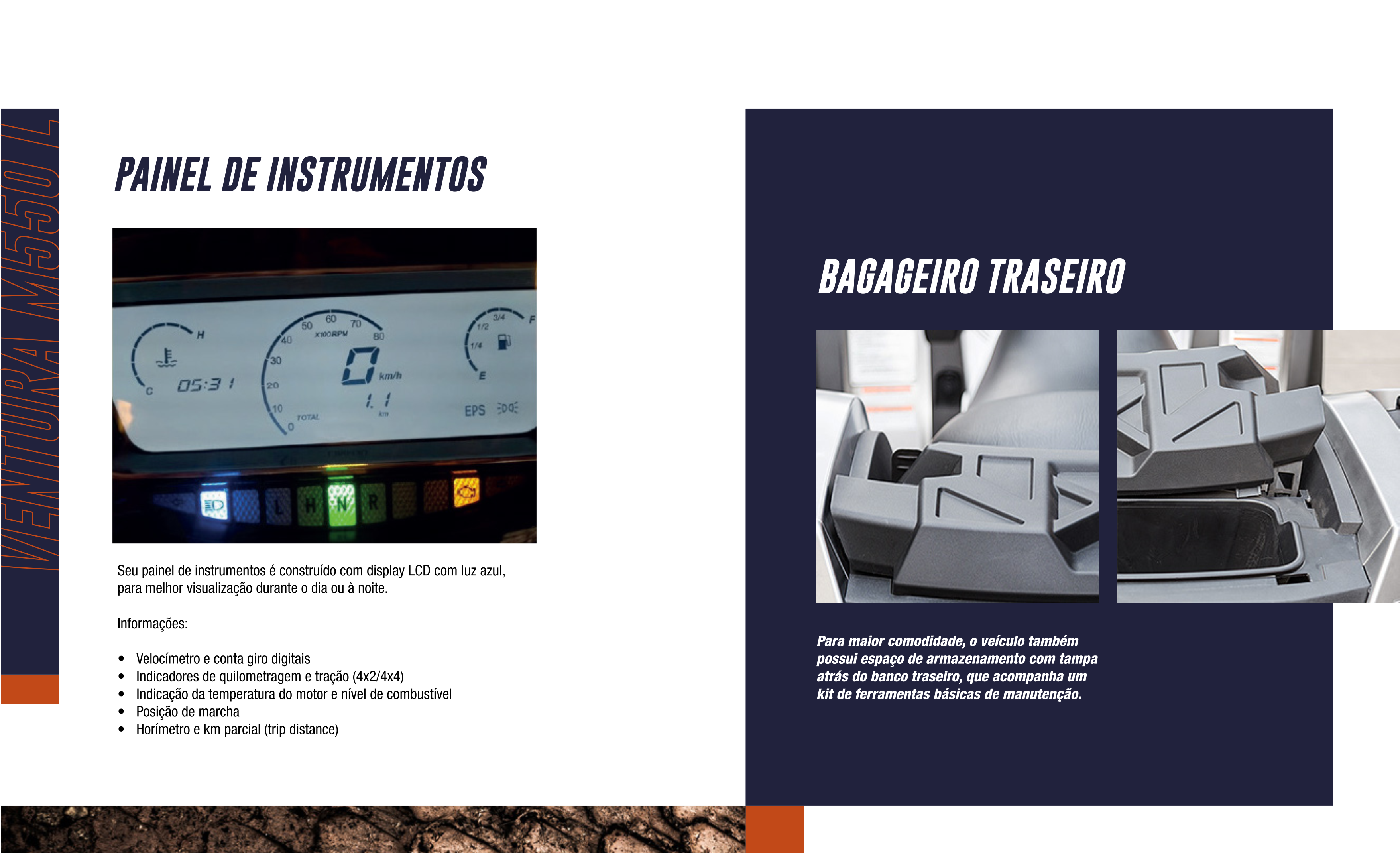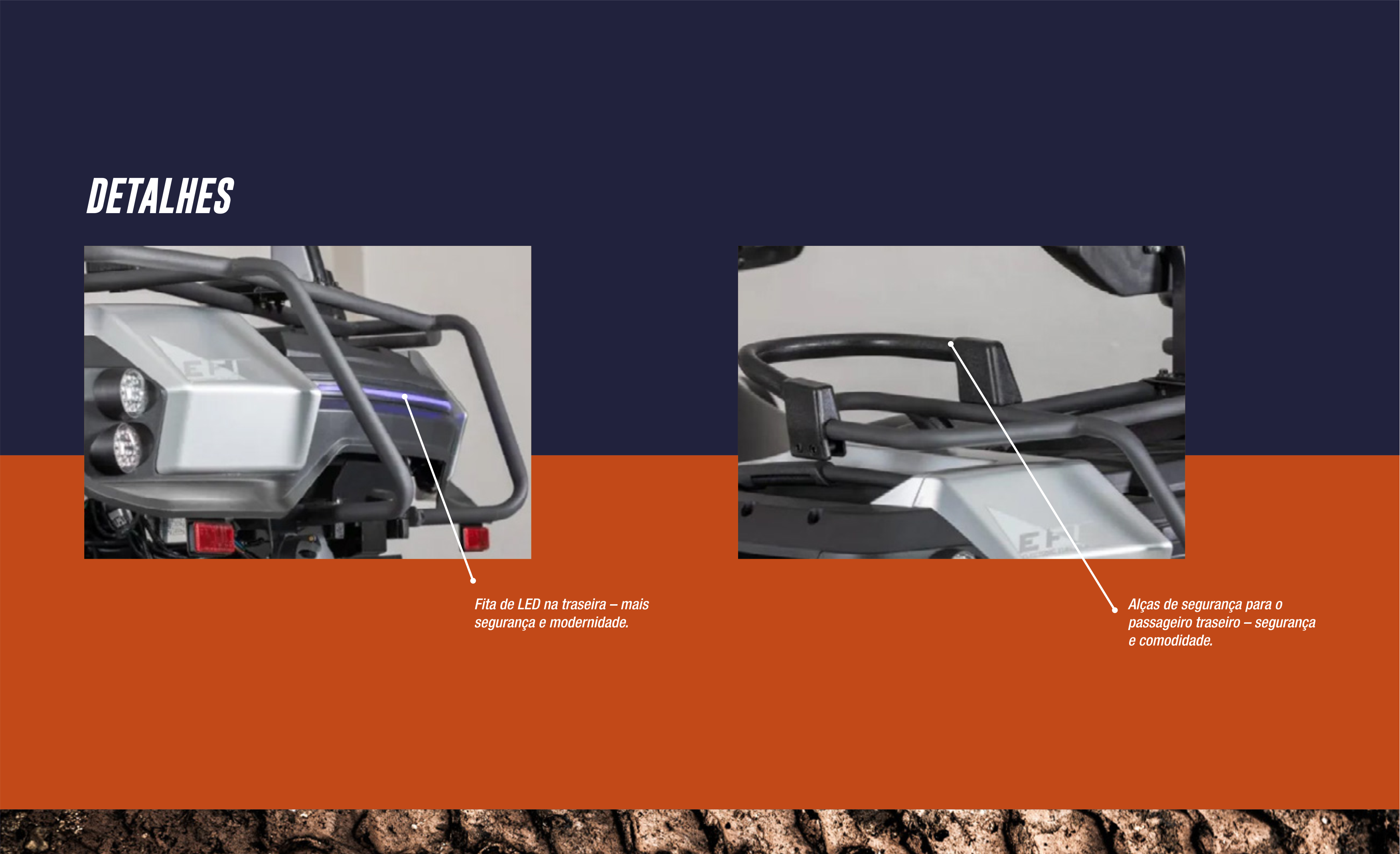 O ATV também oferece espaço de armazenamento com tampa atrás do banco traseiro, que acompanha um kit de ferramentas básicas de manutenção.
