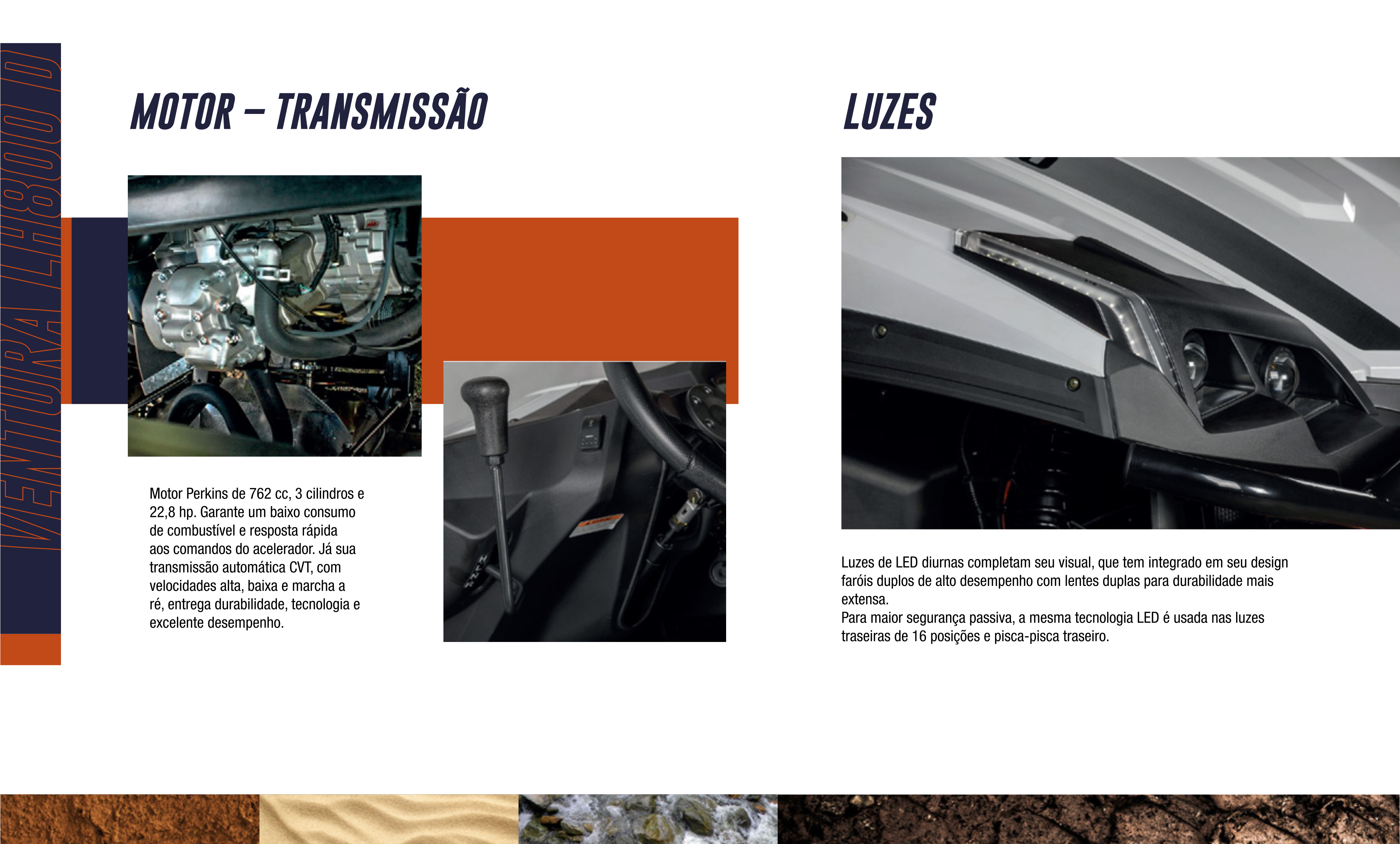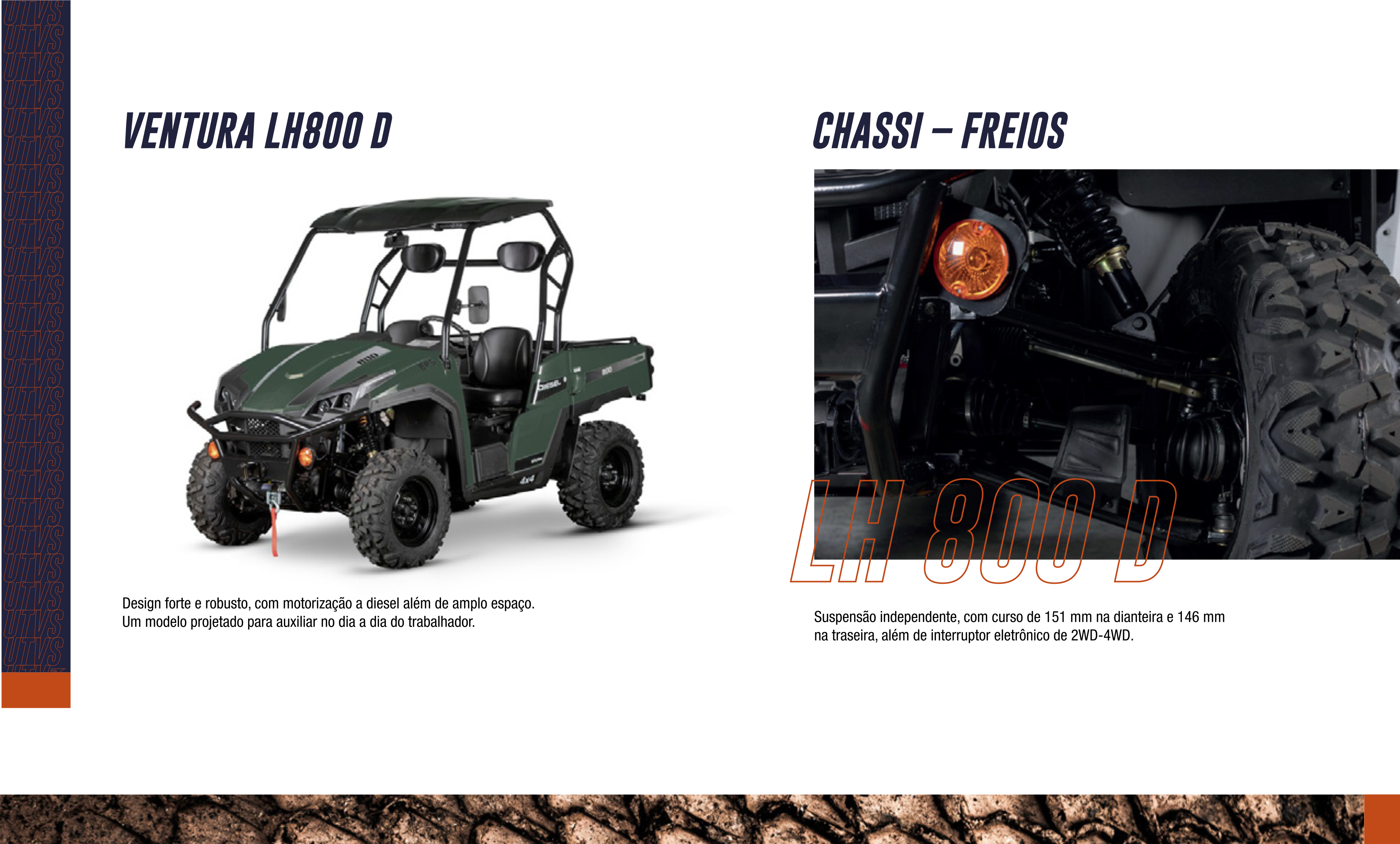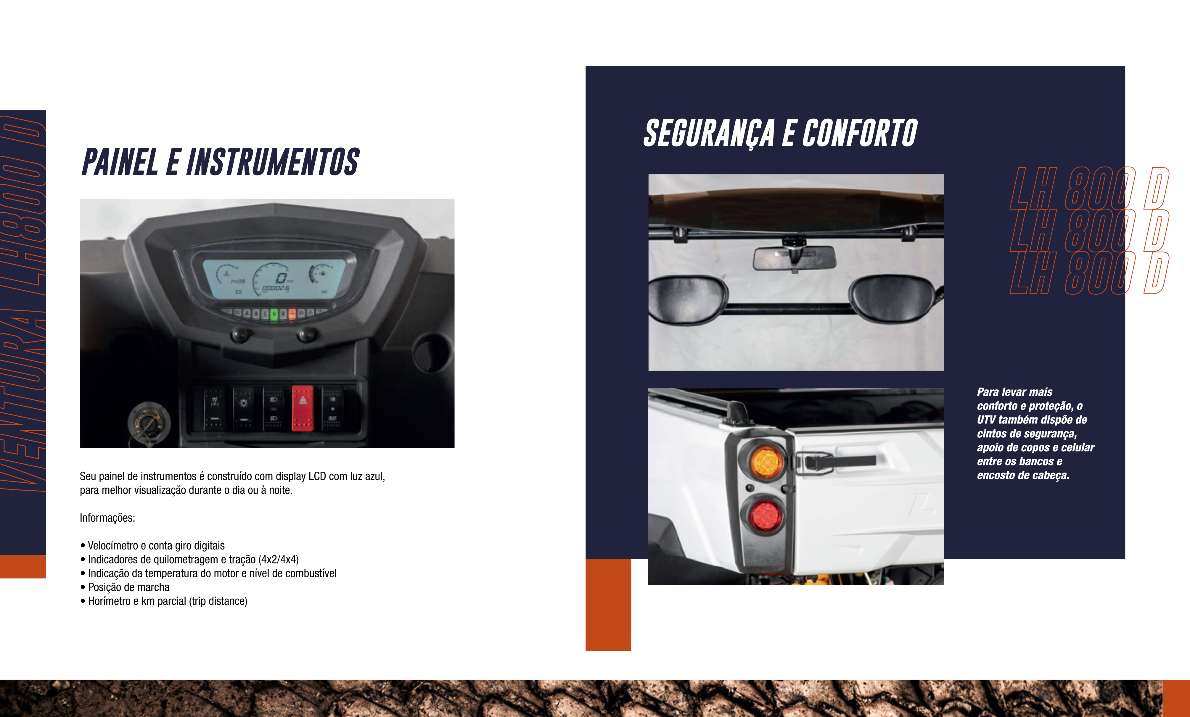 Se você procura um UTV realmente forte e robusto e pronto para te auxiliar no trabalho em qualquer condição, o Ventura LH800 D é a sua melhor opção. O veículo oferece motorização a diesel, amplo espaço interno e segurança de sobra para vencer qualquer desafio.